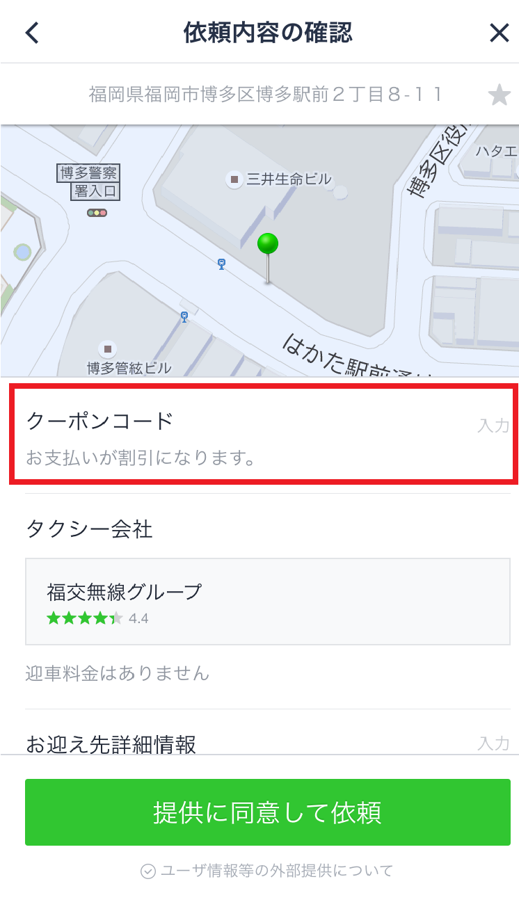 A.LINE TAXIを起動後、乗車位置を決定し、「依頼内容の確認」画面に進むと、“クーポンコード” という欄が現れます。そちらにお持ちのクーポンコードをご入力ください。