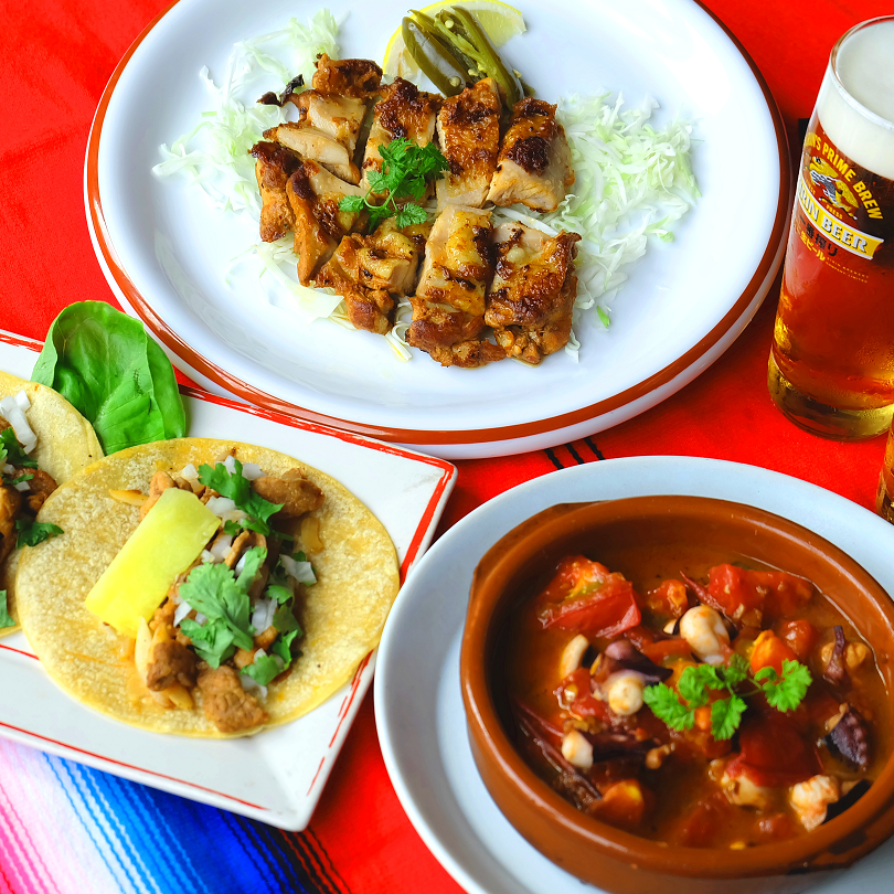 【メニュー詳細】 10種以上のスパイスを使った豚肉のタコス2枚/タコと完熟トマトのピリ辛マリネ/鶏肉を24時間漬け込んだスモークグリル/生ビール2杯 |