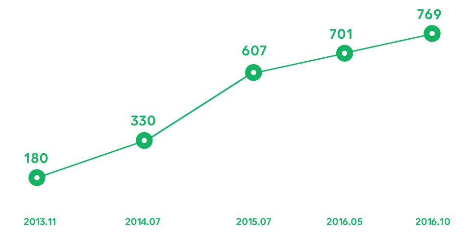 設立時の社員数は約180名、現在は769名(2016年10月現在)まで拡大。